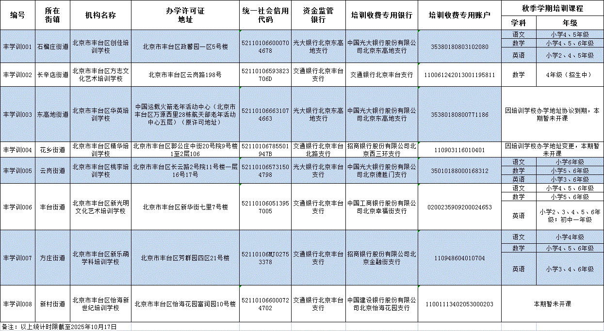 2025年丰台区学科类校外培训机构秋季学期开班情况一览表