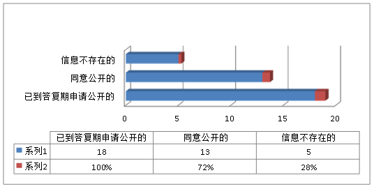 受理申请总数为18件。其中,当面申请18件,传真形式申请件0件。 已到答复期的18件申请全部按期答复。