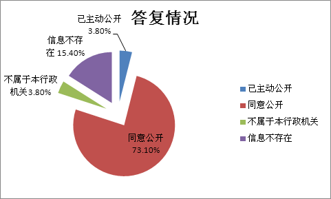 截止到2017年12月31日,26件依申请公开信息按期答复26件,其中:“属于已主动公开范围”1项,占总数的3.8%;“同意公开”19项,占总数的73.1%;“不属于本行政机关公开”1项,占总数的3.8%;“申请信息不存在”4件,占总数的15.4%。