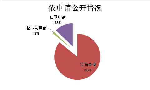 2018年全局申请总数为78件(其中6件结转至2019年办结)。其中,当面申请67件,占总数的85.9%;通过互联网申请1件,占总数的1.3%;以信函形式申请10件,占总数的12.8%。