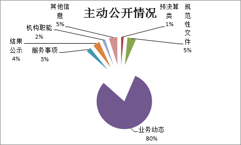 在主动公开的402条信息中,预决算类信息6条,占总体的比例为1.5%;规范性文件信息20条,占总体的比例为5.0%;业务动态类信息322条,占总体的比例为80.1%;服务事项信息11条,占总体的比例为2.7%;结果公示信息16条,占总体的比例为4.0%;机构职能类信息7条,占总体的比例为1.7%;其他信息20条,占总体的比例为5.0%。