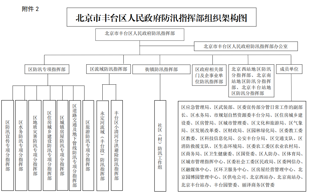 区防汛指挥部成员单位包括:区委宣传部、区委网信办、区武装部、区发展改革委、区教委、区科信局、区民政局、区财政局、规划自然资源委丰台分局、区生态环境局、区住房和城乡建设委员会、区城管委、区水务局、区农业农村局、区商务局、区文化和旅游局、区卫生健康委员会、区应急局、区国资委、区体育局、区园林绿化局、区气象局、区人防办、区房管局、区城指中心、区融媒体中心、区环卫中心、区房管中心、北京园博园管理中心、丽泽商务区管委、区公安分局、区交通支队、区消防支队、区供电公司、北京西站地区管理办公室、北京南站地区管理办公室、北京丰台站地区管理办公室。各成员单位按照区防汛指挥部要求做好防汛相关工作,各成员单位主要职责详见附件1。