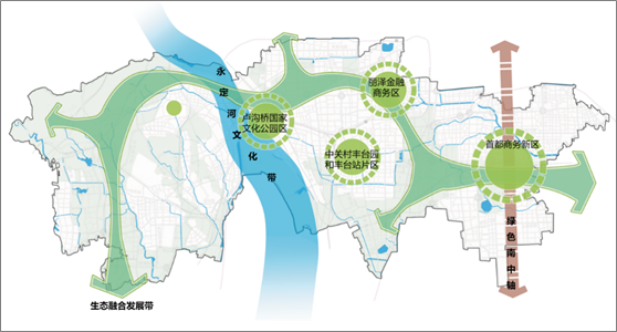 按照河流等级构建不同宽度的河流绿廊,打造蓝绿交织、林水交融、水清岸绿的魅力蓝脉绿网,主要涉及永定河、凉水河、马草河、丰草河、哑叭河等河流廊道。