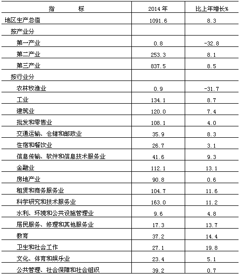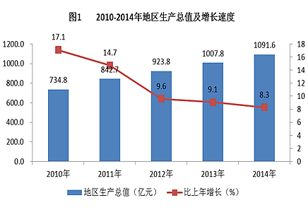 经济增长:初步核算,全年实现地区生产总值1091.6亿元,比上年增长8.3%。其中,第一产业增加值0.8亿元,下降32.8%;第二产业增加值253.3亿元,增长8.1%;第三产业增加值837.5亿元,增长8.5%。