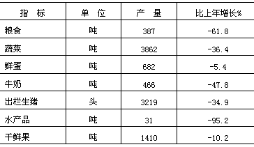 全区粮食播种面积1946亩,比上年下降48.1%;粮食产量387吨,下降61.8%;粮食亩产198.6公斤,下降26.3%。