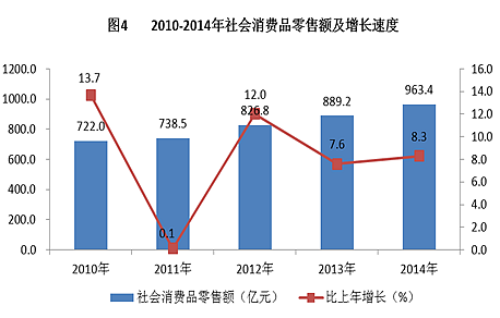 全年实现社会消费品零售额963.4亿元,比上年增长8.3%。在限额以上批发和零售企业中,汽车类实现零售额226.8亿元,下降10.1%;中西药品类实现零售额135.2亿元,增长17.3%;食品类实现零售额66.8亿元,下降3.1%;服装类实现零售额16亿元,下降43.7%。