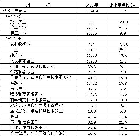 经济增长:初步核算,全年实现地区生产总值1169.9亿元,比上年增长7.2%。其中,第一产业增加值0.6亿元,下降23%;第二产业增加值249.3亿元,下降1.6%;第三产业增加值920亿元,增长9.9%。