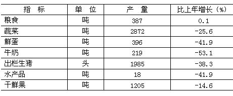 全区粮食播种面积1295亩,比上年下降33.5%;粮食产量387吨,增长0.1%;粮食亩产298.7公斤,增长50.4%。