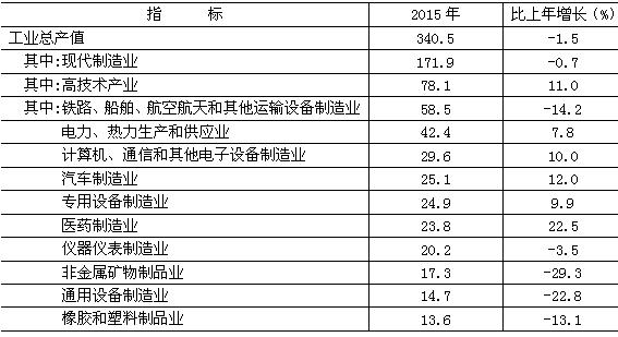 工业:全年规模以上工业企业实现工业总产值340.5亿元,比上年下降1.5%。其中高技术产业实现产值78.1亿元,增长11%;现代制造业实现产值171.9亿元,下降0.7%。从主要行业看,产值列前10位的行业有一半实现增长,其中电力、热力生产和供应业,计算机、通信和其他电子设备制造业,汽车制造业分别增长7.8%、10%和12%。