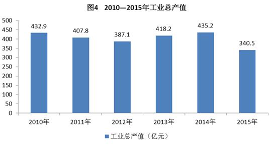 “十二五”时期,全区工业总产值年均下降4.7%(“十一五”时期年均增长10%)。