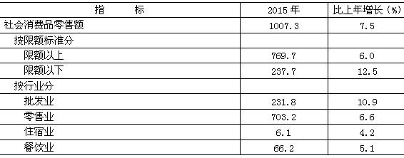 全年实现社会消费品零售额1007.3亿元,比上年增长7.5%。在限额以上批发和零售企业中,汽车类实现零售额230.6亿元,下降1.4%;中西药品类实现零售额155.6亿元,增长14.2%;食品类实现零售额61亿元,增长3.3%;服装类实现零售额15.2亿元,下降7.1%。