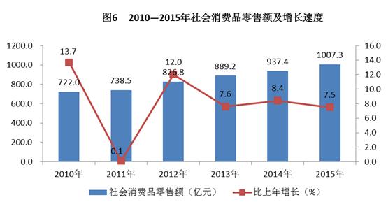 “十二五”时期,全区累计实现社会消费品零售额4351.8亿元,是“十一五”时期的1.7倍,年均增长7.7%,低于“十一五”时期平均增速9.3个百分点。