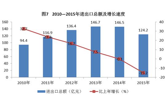 全年海关进出口总额124.2亿美元,比上年下降15.2%。其中进口99.8亿美元,下降22.3%;出口24.4亿美元,增长35.3%。“十二五”时期,全区海关进出口总额累计达到670.6亿美元,是“十一五”时期的2.1倍;其中出口97.5亿美元,进口573.1亿美元,分别是“十一五”时期的1.8倍和2.2倍。