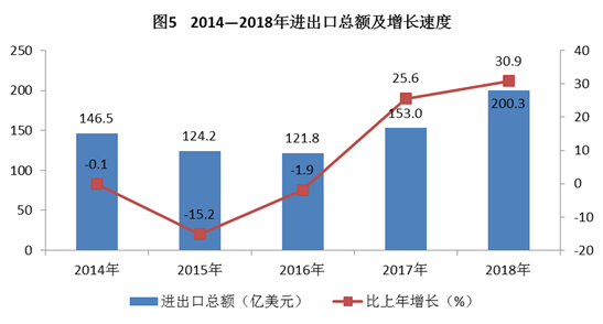 对外经济:全年进出口总额200.3亿美元,比上年增长30.9%。其中,进口152.5亿美元,增长31.2%;出口47.7亿美元,增长29.8%。