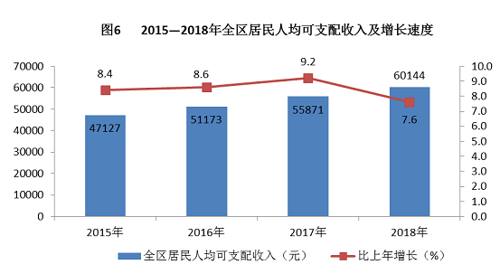 人民生活:全年全区居民人均可支配收入60144元,比上年增长7.6%。全区居民人均消费支出40927元,比上年增长7.3%;恩格尔系数为19.6%,比上年下降1个百分点。全区居民人均住房建筑面积30.7平方米,比上年增加1.5平方米。
