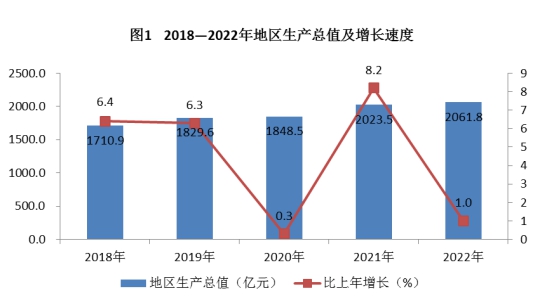 经济发展:初步核算,全年实现地区生产总值2061.8亿元,按不变价格计算,比上年增长1%。其中,第一产业增加值0.8亿元,增长6%;第二产业增加值310.3亿元,下降6.3%;第三产业增加值1750.7亿元,增长2.4%。三次产业结构为0.04:15.0:84.9。按常住人口计算,全区人均地区生产总值为10.2万元,比上年增长2.1%。