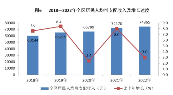 人民生活:全年全区居民人均可支配收入74365元,比上年增长3%。从收入构成看,全区居民人均工资性收入44085元,增长3.3%;人均经营净收入864元,增长1.7%;人均财产净收入10699元,增长2.7%;人均转移净收入18718元,增长2.7%。全区居民人均消费支出44516元,比上年增长2.7%;恩格尔系数为22.0%,比上年上升0.8个百分点。全区居民人均住房建筑面积30.93平方米,比上年增加0.41平方米。