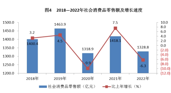 全年实现社会消费品零售额1328.8亿元,比上年下降6.3%,其中限额以上批发零售和住宿餐饮企业实现网上零售额425.2亿元,增长3.3%。在限额以上批发和零售业中,汽车类实现零售额115.5亿元,比上年下降20.9%;日用品类实现零售额43.7亿元,增长92.6%;中西药品类实现零售额23.5亿元,增长12.9%。