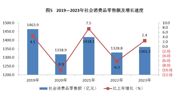 全年实现社会消费品零售额1361.3亿元,比上年增长2.4%。其中,限额以上批发零售业和住宿餐饮业实现网上零售额409.9亿元,下降9.7%。在限额以上批发和零售业中,汽车类实现零售额131.8亿元,比上年增长6.1%;中西药品类实现零售额27.9亿元,增长16.5%;日用品类实现零售额21.6亿元,下降50.4%。