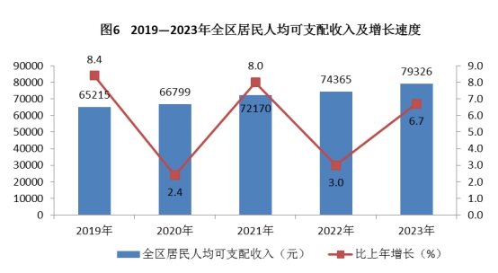 人民生活:全年全区居民人均可支配收入79326元,比上年增长6.7%。从收入构成看,全区居民人均工资性收入47937元,增长8.7%;人均经营净收入1070元,增长23.8%;人均财产净收入10928元,增长2.1%;人均转移净收入19391元,增长3.6%。
