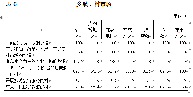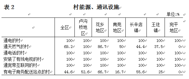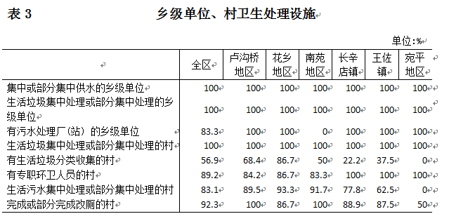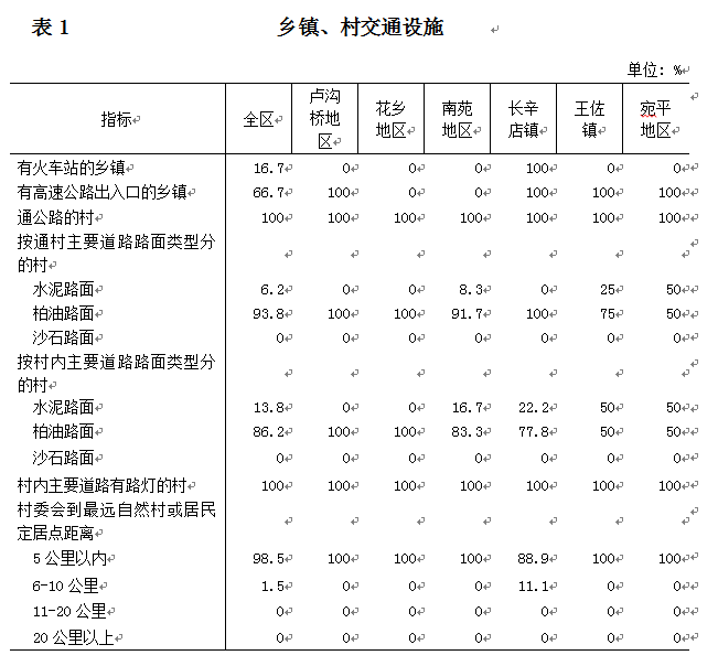 丰台区第三次全国农业普查对全区6个乡级单位和65个村级单位的基础设施建设和基本社会服务进行了调查。现将主要结果公布如下: