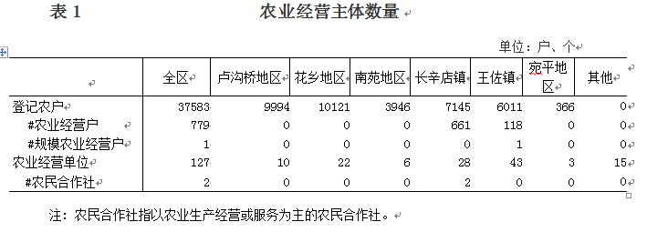 1.农业经营户:指居住在丰台区辖区内,从事农、林、牧、渔业及农林牧渔服务业的农业经营户。