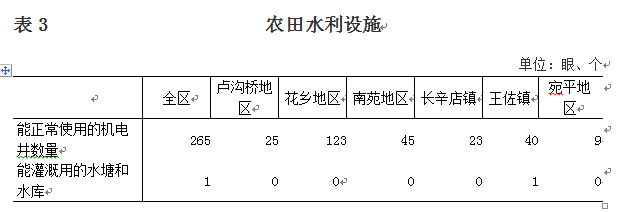 2016年末,全区调查村中能够正常使用的机电井数量265眼,能够使用的灌溉用水塘和水库数量1个。