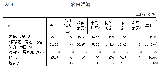 2016年末,全区灌溉耕地面积98.22公顷,其中有喷灌、滴灌、渗灌设施的耕地面积61.23公顷;灌溉用水主要水源中,使用地下水的户和农业生产单位占98.5%,使用地表水的户和农业生产单位占1.5%。