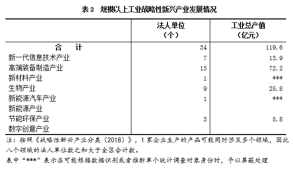 2018年,全区从事战略性新兴产业生产的规模以上工业法人单位工业总产值119.6亿元,比2014年增长15.6%;占规模以上工业法人单位的26.4%,比2014年下降3.1个百分点。其中,新一代信息技术产业13.9亿元,占规模以上工业战略性新兴产业法人单位的11.6%;生物产业25.8亿元,占21.6%;高端装备制造产业72.2亿元,占60.4%(详见表2)。