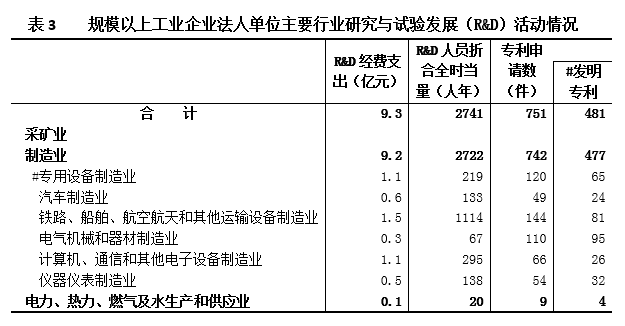 2018年,规模以上工业企业法人单位中开展R&D活动的占51.8%,比2013年提高15个百分点。R&D人员折合全时当量2741人年。R&D经费支出9.3亿元,比2013年减少23.2%;R&D经费与营业收入之比为2.8%,比2013年提高0.3个百分点。
