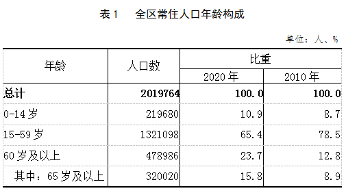 全区常住人口中,0-14岁[5]人口为219680人,占10.9%;15-59岁人口为1321098人,占65.4%;60岁及以上人口为478986人,占23.7%,其中65岁及以上人口为320020人,占15.8%。