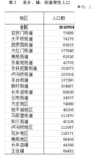 全区21个乡、镇、街道中,常住人口在10万人以上的有8个,分别是卢沟桥街道、新村街道、大红门街道、东铁匠营街道、丰台街道、花乡地区、卢沟桥地区、马家堡街道;在5万人-10万人之间的有8个,分别是长辛店街道、西罗园街道、方庄地区、太平桥街道、右安门街道、南苑街道、王佐镇、南苑地区;在5万人以下的有5个,分别是宛平城地区、长辛店镇、东高地街道、和义街道、云岗街道。