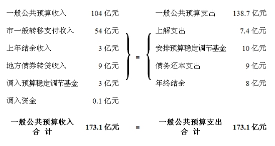 区级一般公共预算收入104亿元,完成预算102%,比上年增长10.1%,同口径增幅20.5%;加市一般转移支付收入54亿元、上年结余收入3亿元、地方债券转贷收入9亿元、调入预算稳定调节基金3亿元、调入资金0.1亿元,收入合计173.1亿元。