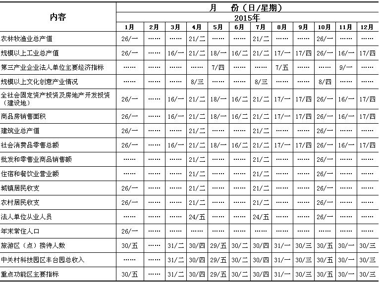 2015年丰台统计信息网主要统计数据发布计划
