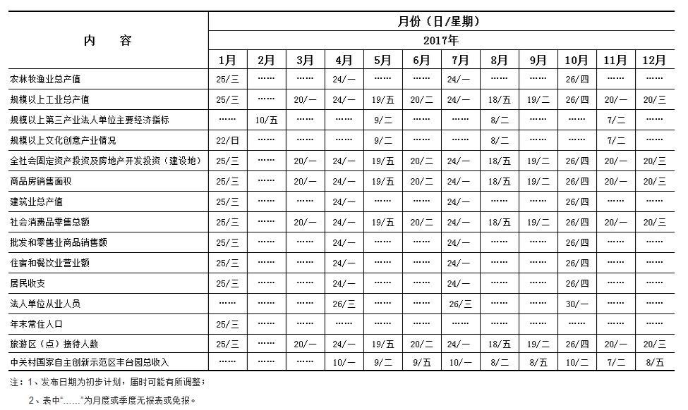 2017年丰台统计信息网主要统计数据发布计划