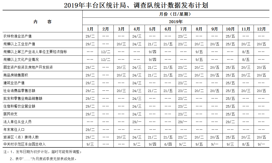 2019年丰台统计信息网主要统计数据发布计划