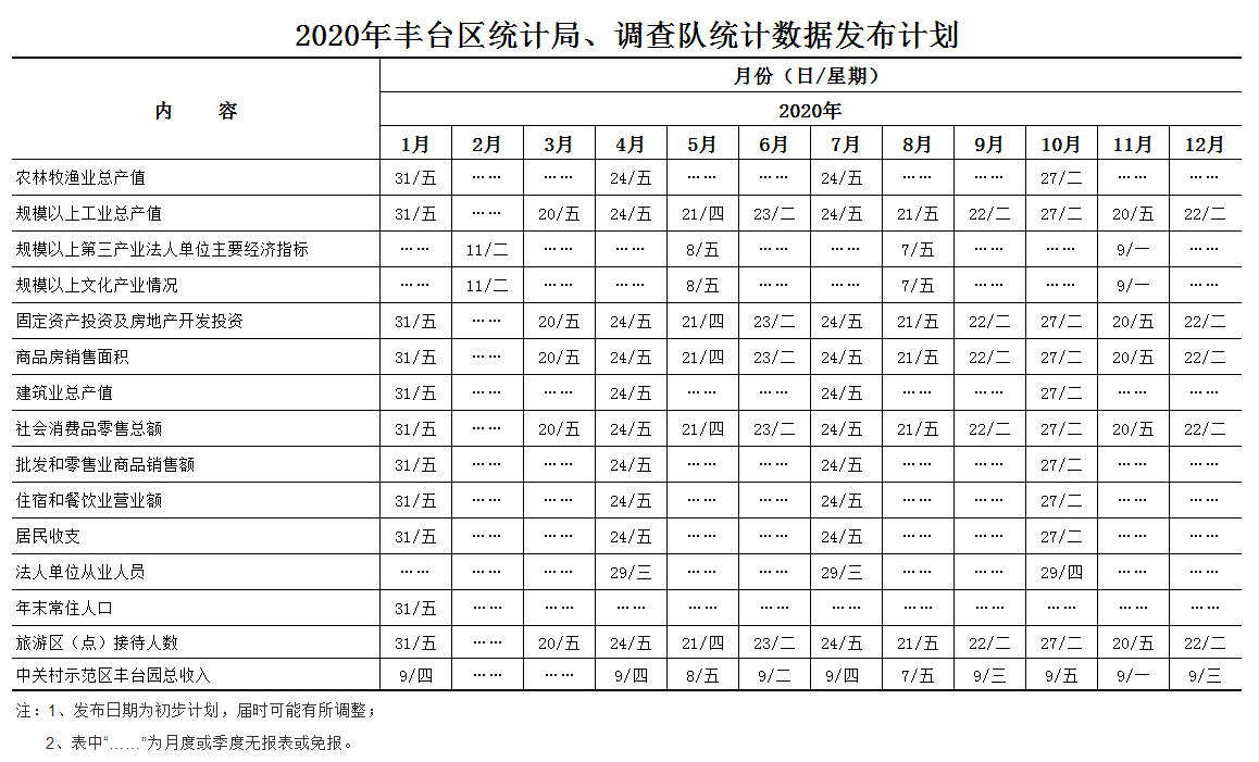2020年丰台区统计局、调查队统计数据发布计划