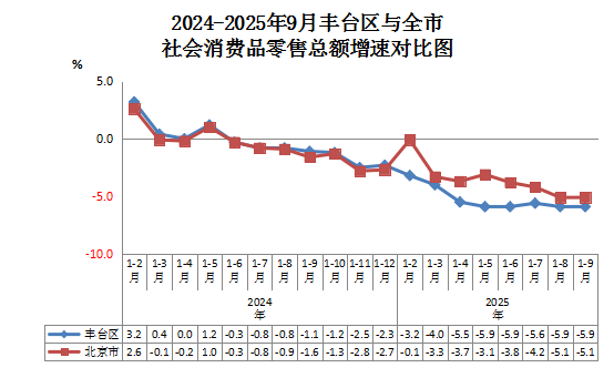 2024-2025年9月丰台区与全市社会消费品零售总额增速对比图