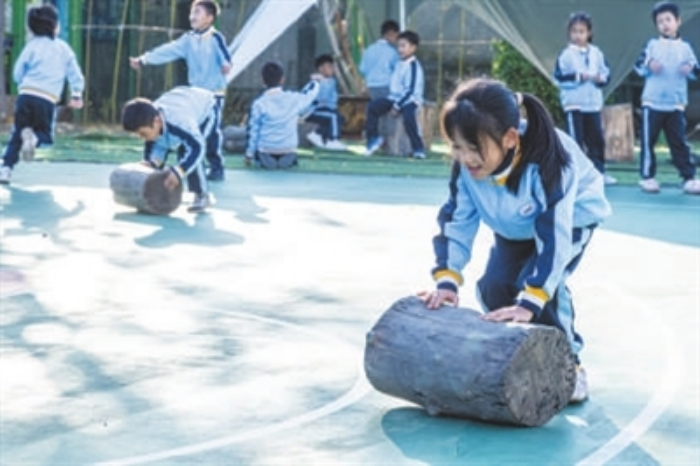 与此同时,学校操场上的一年级新生们正进行着别开生面的接力赛——他们弯着腰,推着木墩向前滚动。一年级年级长夏颃淇介绍:“这些木墩是学校里死去的一棵树锯成的,课间时孩子们可以滚木墩,也可以玩抢椅子游戏。”