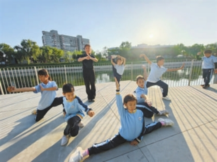 爬树,对现在大多数孩子来说并不是简单的游戏,更是一门需要领悟的生活技能。“掌握了巧劲儿就很容易上去。”一名学生像个经验丰富的“小教练”般分享心得。不远处,武术队的孩子们在粼粼波光映照下练习空手翻、前空翻、竖叉,一个个动作干净利落,洋溢着蓬勃的生命力。