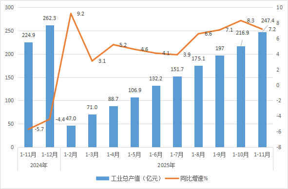 图1:2024年11月-2025年11月丰台区工业总产值及增速