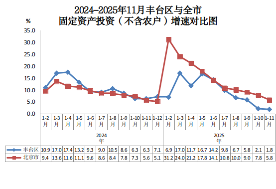 2024-2025年11月丰台区与全市固定资产投资(不含农户)增速对比图