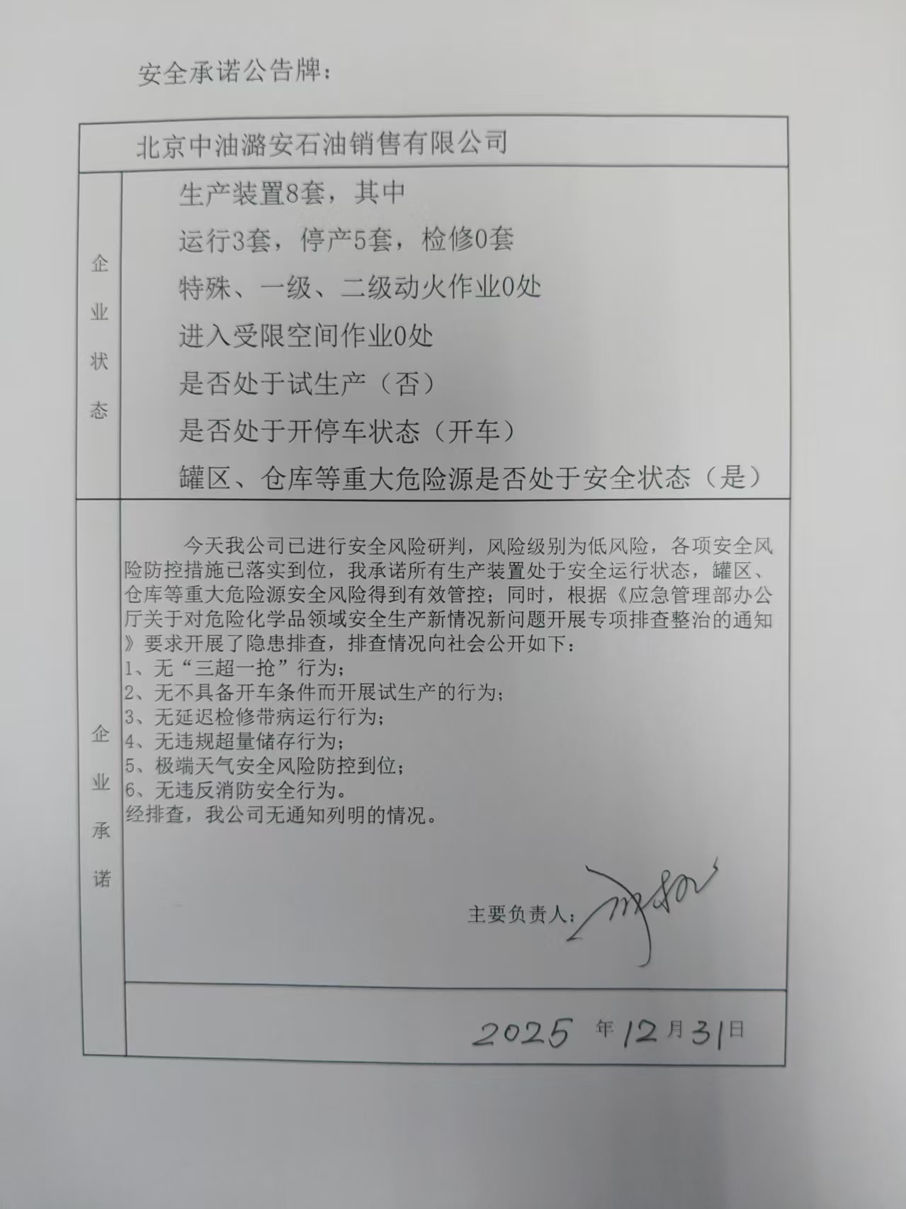 北京中油潞安石油销售有限公司安全承诺公告牌1231