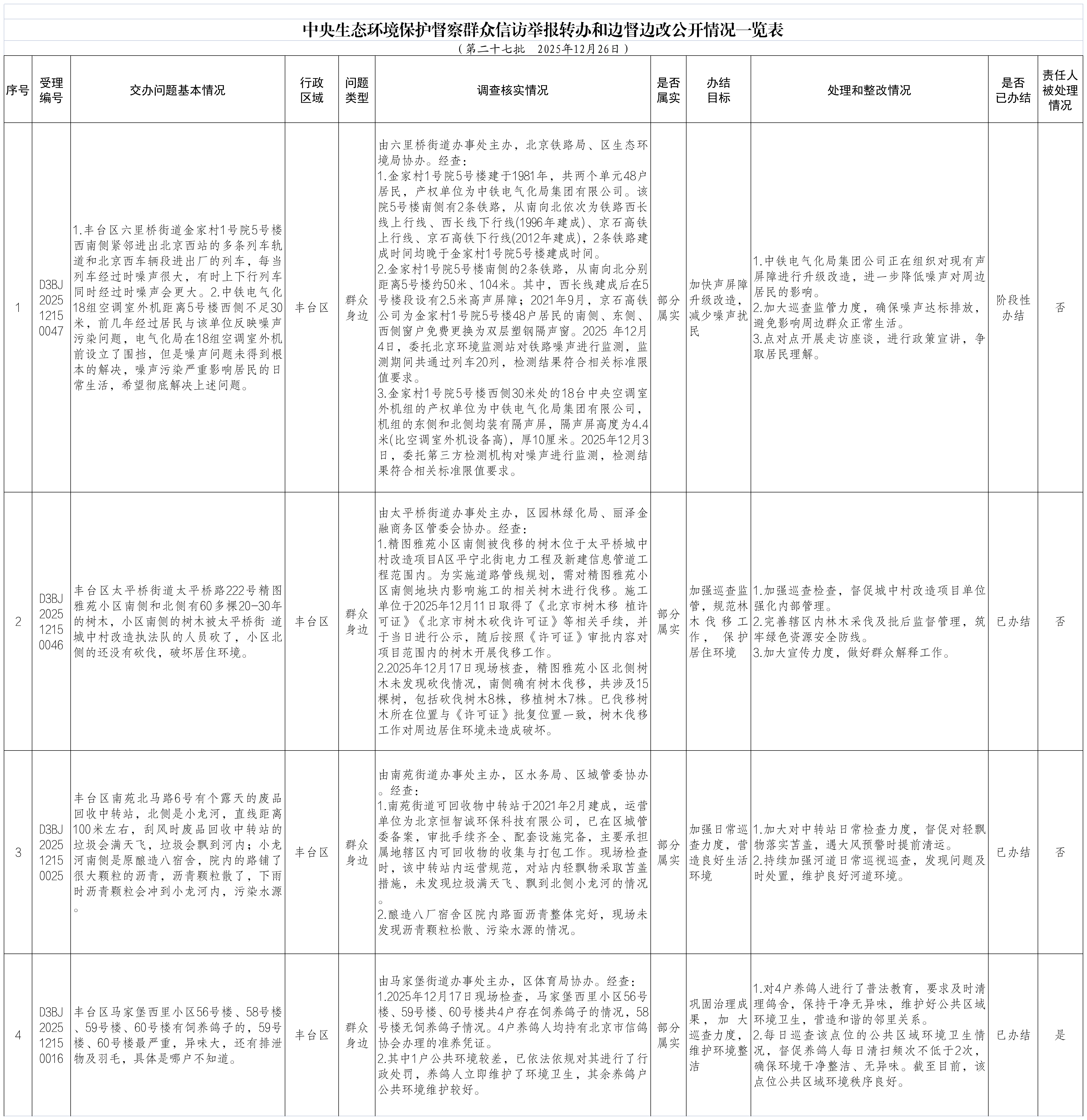 2025年12月16日,中央第一生态环境保护督察组向北京市交办第二十七批群众信访举报件33件,涉及丰台区4件。现按要求向社会公开本区该批次《中央生态环境保护督察群众信访举报转办和边督边改公开情况一览表》(见下表)。