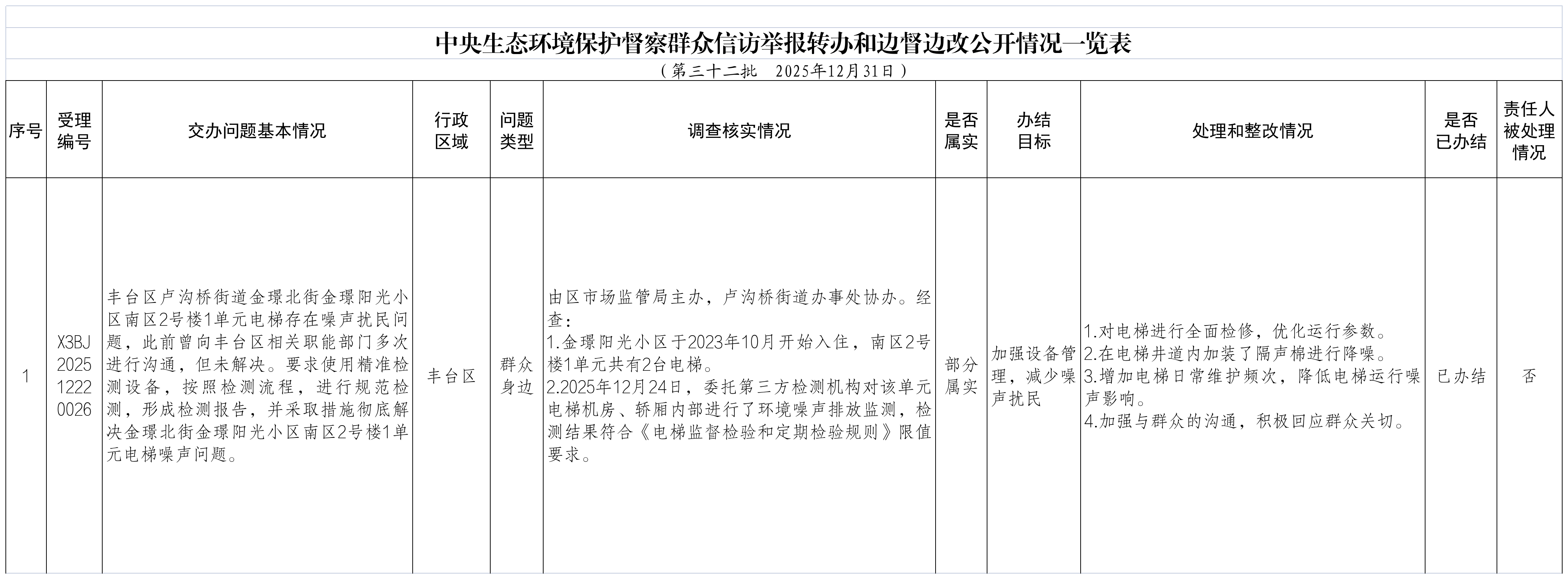 2025年12月23日,中央第一生态环境保护督察组向北京市交办第三十二批群众信访举报件11件,涉及丰台区1件。现按要求向社会公开本区该批次《中央生态环境保护督察群众信访举报转办和边督边改公开情况一览表》(见下表)。
